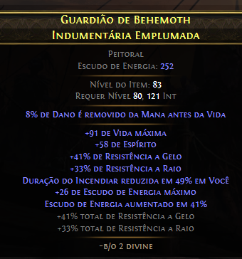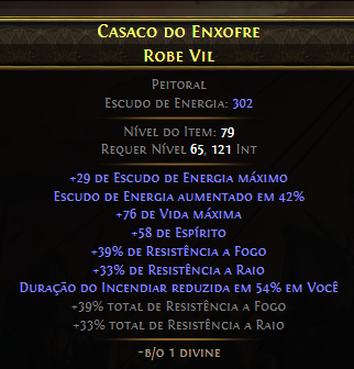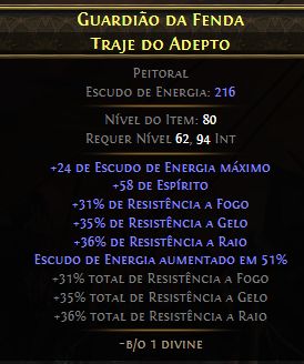 Presságio da Exaltação Hábil, para ganhar 2 linhas de +% de resistências. - 23.81% de chance de cair Resistência de Fogo, Gelo e Raio se você usou uma base com +% de Resistência de Caos.