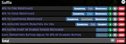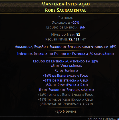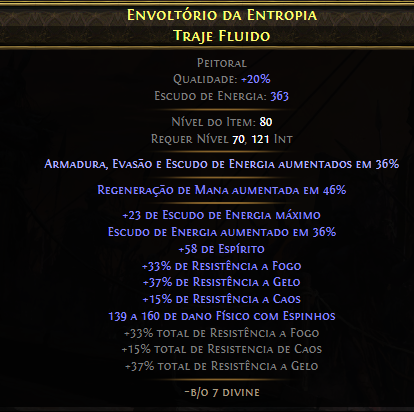 Presságio da Exaltação Hábil, para ganhar 2 linhas de +% de resistências. - 23.81% de chance de cair Resistência de Fogo, Gelo e Raio se você usou uma base com +% de Resistência de Caos.