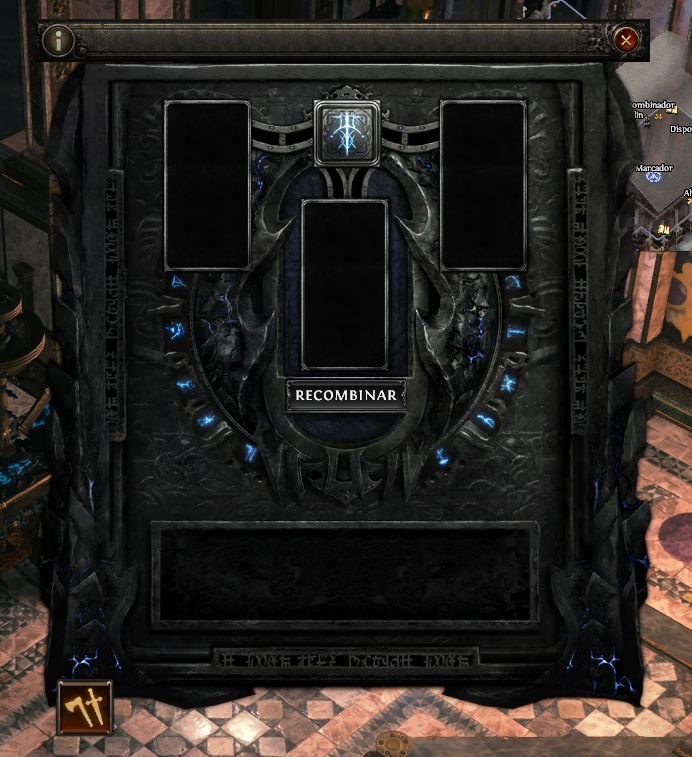 O recombinador é uma bancada de craft onde você coloca dois itens. É necessário selecionar pelo menos um modificador em cada item, e o jogo mostrará uma probabilidade de sucesso (variando de 0% a 100%) no centro. Você pode selecionar até 6 modificadores no total entre os dois itens. O mesmo tipo de modificador não pode ser selecionado duas vezes (ex.: 2x dano de raio). Depois, basta clicar em recombinar.